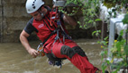 En début d'après midi les hommes du GRIMP (groupe d'intervention et de reconnaissance en milieux périlleux) harnachées dans le vide au dessus de la rivière sont intervenus pour dégager les ouvrages d'encombrants déchets : poutres, arbres entiers, bidons.
