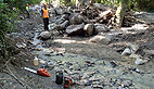 Un chantier difficile pour les ouvriers de la SOFOPA, une entreprise spécialisée dans les travaux en forêt basée à Pamiers qui travaille depuis trois semaines à dégager sur plus d’1,5 km les arbres emportés par la vague. La pente est raide, le terrain glissant, il faut escalader les blocs de pierre, évoluer dans le lit du ruisseau, remonter le bois entre 3 et 5 mètres sur les parties les plus accessibles. Presque la routine pour Mohamed et son équipe qui ont dû comme chaque matin transporter tronçonneuses et bidons d’essence.