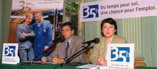 "Projet de société" pour les uns, réforme "autoritaire" pour les autres : la réduction du temps de travail, "bébé" de Martine Aubry, la ministre de l'Emploi, déclenche une quasi guerre froide entre gauche et droite, qui cohabitent sous la présidence de Jacques Chirac.