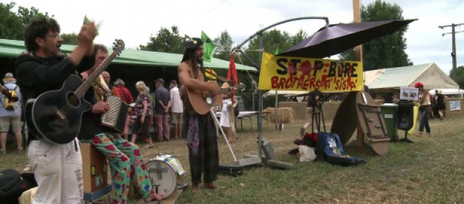 A l'entrée du site, à Vigneux-de-Bretagne (Loire-Atlantique), où est organisé le quinzième rassemblement estival annuel des opposants au transfert de l'aéroport de Nantes-Atlantique à Notre-Dame-des-Landes, en plein bocage, une grande banderole proclame: "Chauffe la lutte, pas le climat", tandis qu'un participant se promène entre les stands avec une pancarte fait maison disant: "Les zadistes sauvent le climat".