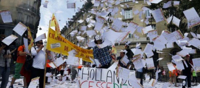 Un peu plus tôt dans la matinée, "quatre tonnes de carottes", en référence à l'enseigne rouge des débits de tabac, avaient été déversées devant le siège du Parti socialiste, rue de Solférino.