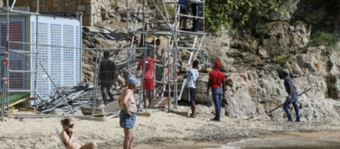 Des ouvriers démontent un échafaudage métallique qui devait servir à construire un escalier pour relier la villa royale à la plage. Un ascenseur métallique, peu esthétique, doit également être retiré, ainsi que la plate-forme en béton qui lui sert d'appui. Cette plate-forme coulée sans autorisation préalable, avant l'arrivée du roi, avait démarré la polémique voici plus de deux semaines.