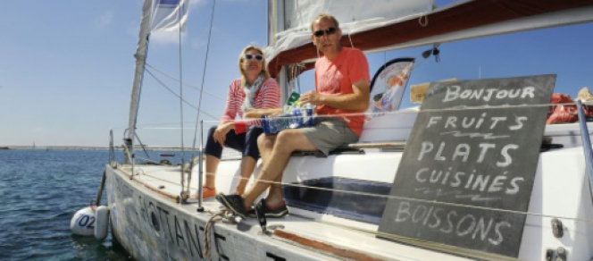 "Épicerie flottante, Breakfast, Croissants, Journaux, Fresh Milk...": le message est clair. Inscrit sur la coque en aluminium du voilier, il invite les plaisanciers, jusqu'à 150 par jour, à venir à bord faire leurs emplettes ou passer commande pour le lendemain.