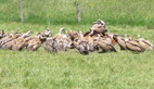 A quelques mètres de là sur une autre parcelle les vaches et leurs veaux s’étaient réfugiés à la lisière d’un bois, harcelés par les vautours (presque autant, une cinquantaine) qui leur mettaient la pression, guettant le moindre faux pas: