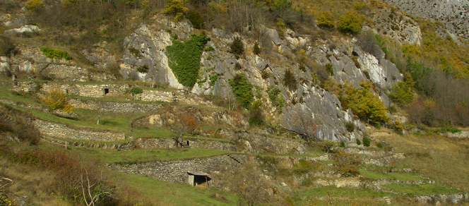 Sur ces terrasses laissées en friches jusque dans les années 1980, débroussaillage, épierrement, travail du sol, restauration de murs permettent l’activité des producteurs d’ovins et de bovins.