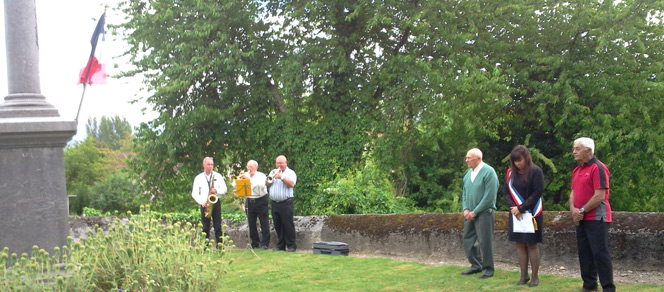 Devant le monument aux morts, après quelques mots de Mme Bernère, les musiciens jouaient la marseillaise puis suivait une minute de silence et les trompettes entonnaient alors le chant des partisans.