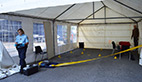 Début d'un travail d'équipe méthodique où chaque centimètre carré est étudié, ratissé. Chaque objet, chaque indice est aussitôt signalés par des triangles jaunes numérotés posés au sol.