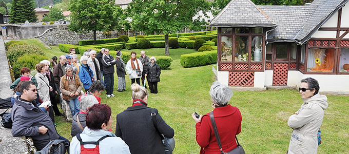 C'est en bordure de la route nationale dans le village de l'Aiguillon que Catherine Robin, animatrice du patrimoine, a accueilli les visiteurs, tous curieux de connaître l'histoire de ce jardin «extraordinaire» à l’emplacement improbable et aux contours mystérieux: l'ensemble des parterres sont délimités par des buis, des érables ou des tilleuls scandent les espaces, les massifs s'organisent en direction de petits bassins alimentés par des jets d'eau et bien que le concepteur ait cherché une certaine régularité, il n'y a pas vraiment de symétrie.