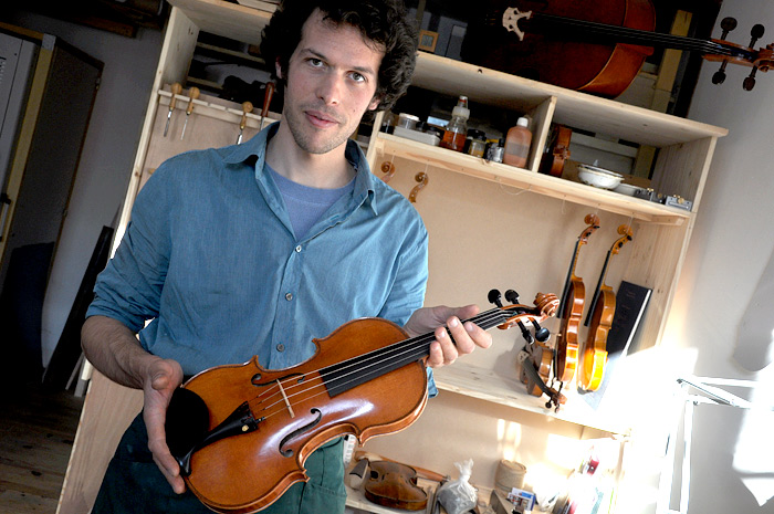 Ce jeune homme posé à la silhouette élancée et aux doigts interminables est luthier depuis six ans. Après des études de biologie et un peu de musique, il décide de se diriger vers du concret.