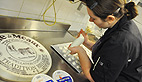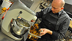 À ses côtés Olivier réalise une terrine de foie gras cuit à basse température alors que Lisa confectionne les macarons qui viendront en décoration sur la buche chocolat blanc et mangue.