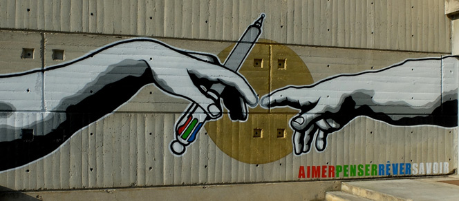 Un peu plus tard, il réalise, dans l’enceinte de la cité scolaire, une autre œuvre inspirée de Michel Ange, dont il réinterprète la célèbre Création d’Adam. «Le fameux Bic 4 couleurs utilisé par beaucoup d’élèves est ici l’allégorie du savoir et de la création». (Voir les graffs de Gehod: «transmettre» au lycée de Mirepoix, réinterprétation de Michel Ange ; «Artiste en herbe» son blaze fait en gazon synthétique).