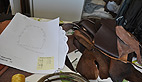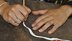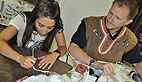 A quelques jours du Préhisto’loft saison 2, les petites mains d’activent e coulisse notamment pour donner une dimension artistique aux vêtements. Audrey, archéologue de formation, mélange les pigments qui serviront à décorer les vêtements de peau, un dispositif de rouge et de blanc, complétant les parures en petits coquillages décoratifs sur les manches et le col.