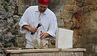 La vie du moyen âge était reconstituée autour de différents thèmes : les combattants et tout ce qui en découle comme l’enseignement de la lutte, de l’épée, le tir à l’arc et les combats en armures. Le moyen âge est également l’apogée de la construction religieuse avec les bâtisseurs des cathédrales. Un tailleur de pierres travaillait et expliquait son art au pied d’un bel échafaudage.