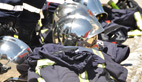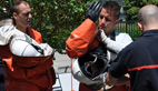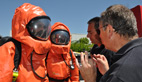 Les binômes se préparent à rentrer en zone contaminée et toxique: les équipiers essaient tant bien que mal d’enfiler de curieuses combinaisons spatiales. «Ce sont des scaphandres anti-gaz, ils pèsent sans les ARI plus d’une dizaine de kilos et à l’intérieur la température du corps peut monter jusqu’à 40 degrés d’où la nécessité de limiter les interventions dans le temps et de s’hydrater rapidement» indique un jeune pompier, «c’est un travail de prise en charge de la victime et d’obturation pour limiter voire supprimer la toxicité du site»
