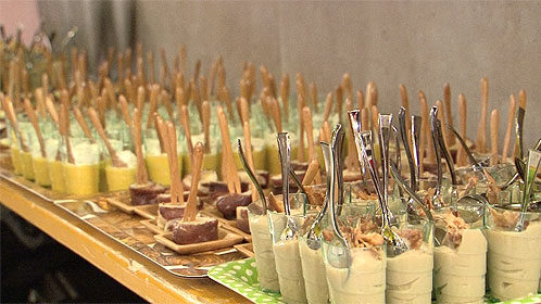Pas un instant à perdre, quatre chefs ariégeois mettent les bouchées doubles pour préparer les produits locaux venus par la route en camion réfrigéré: bonbons de chèvre à l’Hypocras et aux épices, financiers pâtes de fruits à la pomme de Mirepoix, velouté de potimarron chantilly au pain d’épices, tartare de bar à l’orange confite, citrons et basilic frais, écrasée de «cocos» en verrine, croustillant de lard de cochon noir bio, sushi ariégeois au foie gras d’ici, escargot de Faurou façon Parmentier… ambiance «master-chef»!