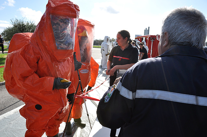 «C’est une situation très exceptionnelle, les enjeux d’un tel exercice reposent sur la mutualisation des ressources et pour arriver à être efficaces, il faut s’entraîner, mesurer les écarts entre les procédures et ce qu’on attend, revoir le matériel pour simplifier les procédures… on évacue les victimes, on fixe la contamination en les poudrant avec un talc à base de terre de foulon. Dans un deuxième temps elles seront transportées sur la chaîne de décontamination pour une décontamination humide»