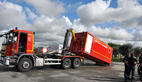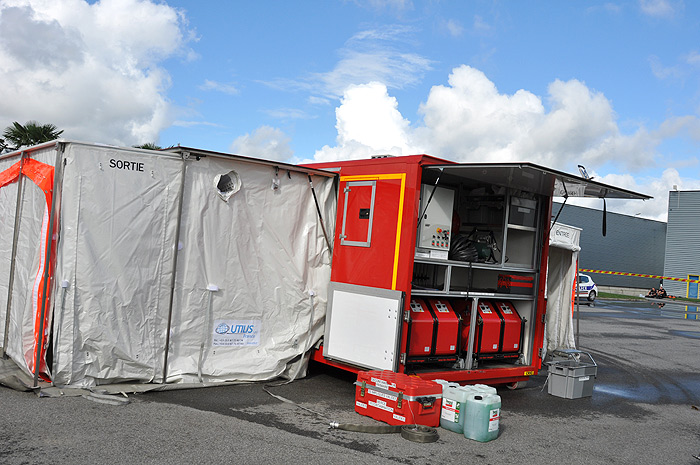 Une berce de décontamination est installée sur site, il s’agit là d’un matériel deuxième génération doté de systèmes de cabines douches pouvant accueillir des victimes invalides sur brancards, capable de traiter 40 personnes à l’heure.