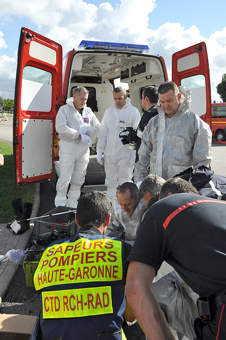 Il y a deux ans nous avions participé à la halle aux Grains de Toulouse à un exercice similaire mais en milieu urbain. Les premiers intervenants ont fait dégager les victimes sur la zone d’exclusion, des pompiers, un médecin du SAMU, un infirmier anesthésiste sont à leur chevet pour procéder aux premiers secours alors que d’autres sapeurs pompiers mettent en œuvre les moyens de décontamination. Il y aura en tout sur ce théâtre d’opération, 85 spécialistes, 35 non-spécialistes et des observateurs extérieurs»