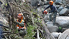 Un chantier difficile pour les ouvriers de la SOFOPA, une entreprise spécialisée dans les travaux en forêt basée à Pamiers qui travaille depuis trois semaines à dégager sur plus d’1,5 km les arbres emportés par la vague. La pente est raide, le terrain glissant, il faut escalader les blocs de pierre, évoluer dans le lit du ruisseau, remonter le bois entre 3 et 5 mètres sur les parties les plus accessibles. Presque la routine pour Mohamed et son équipe qui ont dû comme chaque matin transporter tronçonneuses et bidons d’essence.