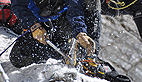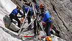 Pendant ce temps le matériel est installé: bipode, treuils, cordes, perche dans laquelle sera installée le blessé en gardant toujours l’axe tête, cou, tronc. Beaucoup du matériel que nous utilisons là est le fruit de nos recherches au centre national d’instruction de ski et d’alpinisme de la gendarmerie de Chamonix»
