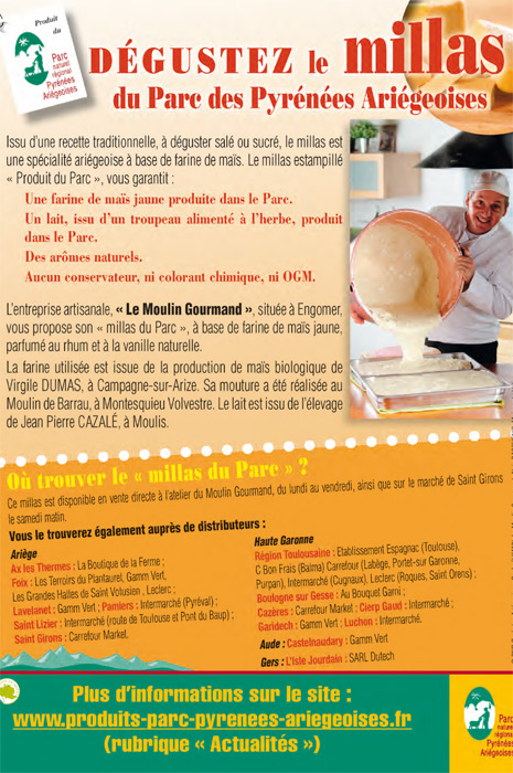 Salé ou sucré tous les plaisirs sont possiblesIssue d’une recette traditionnelle, cette opération «Dégustez le millas du Parc des Pyrénées Ariégeoises» permet de revisiter cette spécialité ariégeoise à base de maïs jaune, salé ou sucré, parfumé au rhum et à la vanille et pour lequel outre l'attention portée à la matière première et aux arômes naturels, l'usage d'aucun conservateur, ni colorant chimique est garanti.