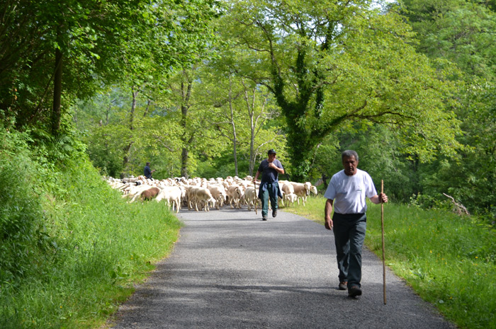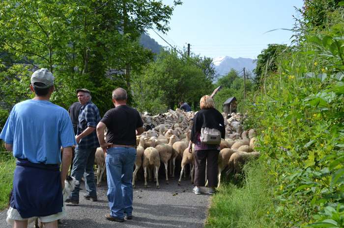 Partis la veille de Lescure, Vincent et Guy Faur à la tête de leurs troupeaux d’ovins de près de 1.000 bêtes ont poussé un peu plus loin encore. Guy emmenant ses quelques 500 bêtes de part les routes et sentiers vers le cadre somptueux du cirque de Campuls sur l’estive de Bethmale.