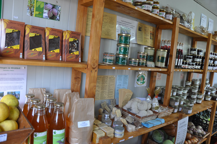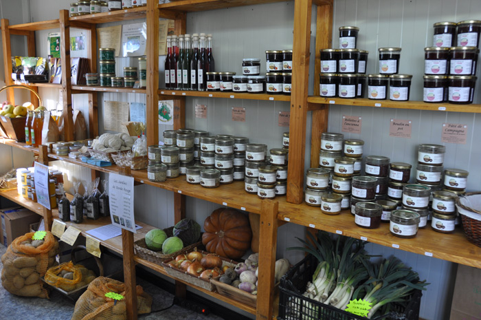 Afin d’étendre son projet de circuit court et de vente à la ferme, l’agriculteur propose dans sa nouvelle échoppe en plus de ses propres productions (agneaux, charcuteries, porcs, volailles, confitures) une sélection de produits provenant de chez ses proches confrères (dans un rayon d’une vingtaine de kilomètres): viandes, fruits, légumes, miels, laitage, confitures, jus de fruits, chocolat, savons… etc.