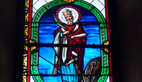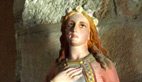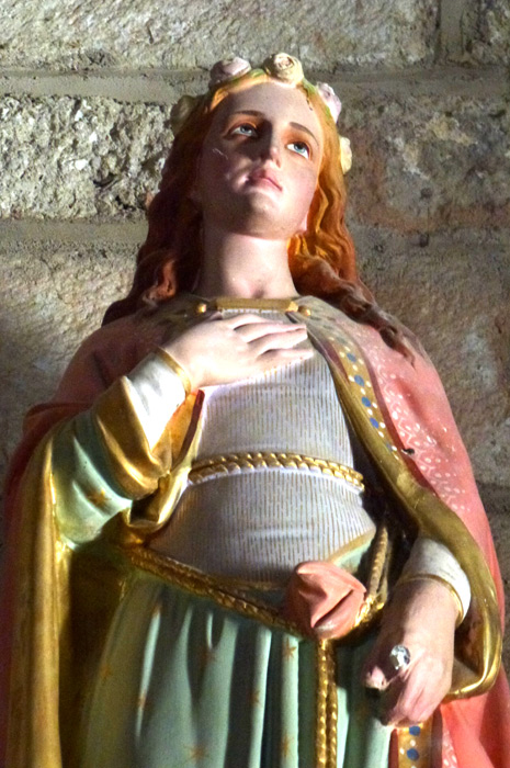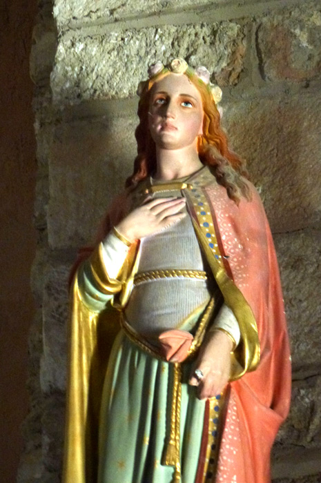 Sur le vitrail de la nef inondé du bleu des cieux, saint Julien semble regarder tendrement face à lui. Ses yeux plongent dans ceux d’une statue de femme, blonde, l’air bienveillant, c’est Basilisse, son épouse, qui a voué sa vie à la charité.