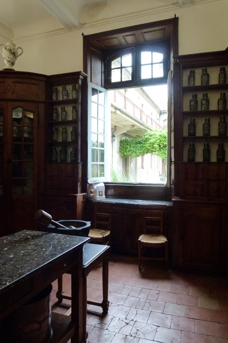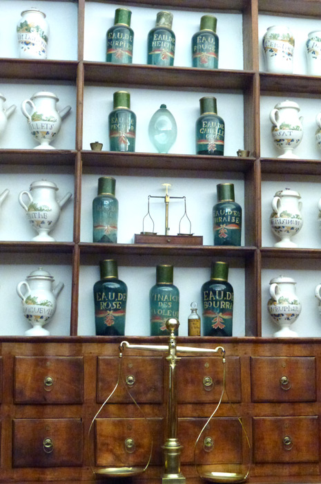 Dans la pharmacie, le regard se pose sur les noms très spéciaux de ces recettes. L’une des 69 bouteilles en verre est étiquetée «Vinaigre des quatre voleurs» Cette recette permit à quatre détrousseurs de victimes de la lèpre, de poursuivre leurs rapines sans tomber malade. En échange de la composition de leur lotion, les voleurs obtinrent la vie sauve.