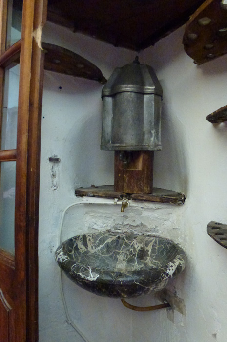 Une fontaine installée dans l’angle de la pièce permettait de laver les mains autant que les instruments souillés. Une trousse de chirurgien renferme des scalpels en acier et à manches d’ébène. Elle appartenait très certainement au médecin d’un bataillon de volontaires nationaux en garnison à Saint-Lizier à la fin du XVIIIème siècle.