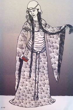 A cette époque, la dame porte un bliaud, longue robe très ample mais bien ajustée jusqu’aux hanches. Une longue ceinture décorative souligne sa taille. Les broderies et les ornements de métal agrémentent la tenue confectionnée en étoffe de Flandre et d’Angleterre.