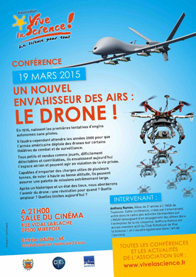 Jeudi 19 mars, l’association Vive la Science vous entrainera, en compagnie d’Anthony Ramos, à la découverte d’un nouvel envahisseur des airs : le drone.