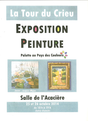 L’association critourienne «Palette au Pays des Couleurs» organise ce weekend, les 25 et 26 octobre, de 10 h à 19 h à l’Acacière (entrée gratuite), son exposition de peinture annuelle à la Tour du Crieu, avec comme invité l’artiste peintre Jacques Majos. Le vernissage aura lieu le samedi 25 à 18 h.