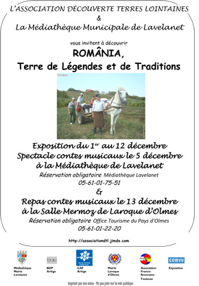 L’Association DTL soutenue par la Caisse d’Allocations familiales de l’Ariège et en partenariat avec la Médiathèque municipale de Lavelanet, l’Association Franco-Roumaine de Toulouse (AFRT) et la Mairie de Laroque d’Olmes, vous propose durant 2 semaines, une exposition culturelle, artisanale et pédagogique, ainsi que des soirées spectacles, dégustations et repas.
