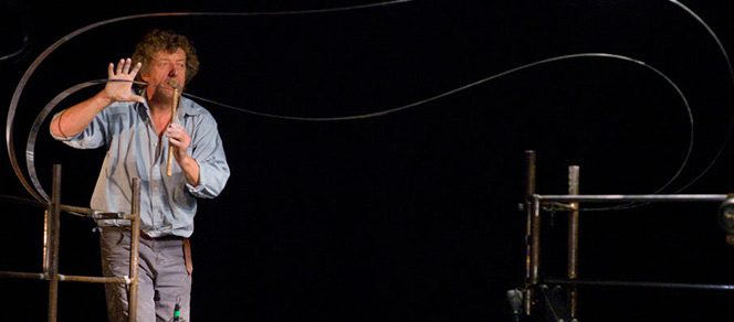 Dans un précédent spectacle l’artiste nous avait surpris en déplaçant et empilant des pierres et des cailloux et son amour de la matière est matérialisé ici par des cubes mous, qui se rencontrant, fusionnant, ne faisant qu’un tel un couple enlacé, pour finir transformés par les mains de l’homme modeleur en un gigantesque phallus qui s’écrasera lamentablement par terre.