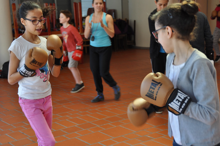 Avec la jeune femme il message est clair, pas de violence dans la boxe française, on peut se défouler, mais en faisant marcher sa tête.