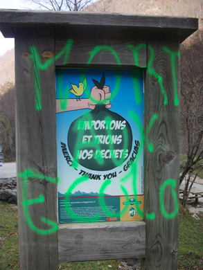 Non seulement la jolie «Maison du Valier» a été bariolée, mais les supports d’information et le mobilier extérieur ont été sciés, démontés, saccagés. Des brasiers ont été également trouvés sur place.