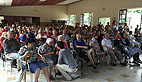 Des retrouvailles oh combien sympathiques, une excellente ambiance, un speaker très en verve pour agrémenter l’arrivée des uns et des autres sur le site et puis la chanteuse Nicole Rieu omniprésente depuis le matin à Lescure aux côtés des ressortissants de Y Arrivarem en fauteuils roulants, puis en divers endroits de la Voie Verte côté Saint-Girons et Foix et enfin sur le site de Combelongue avec le groupe rassemblé des deux ateliers qu’elle avait animés la veille, pour interpréter notamment, à plusieurs voix, la chanson qu’elle vient de composer sur la Voie Verte et qui va désormais faire le tour de France.