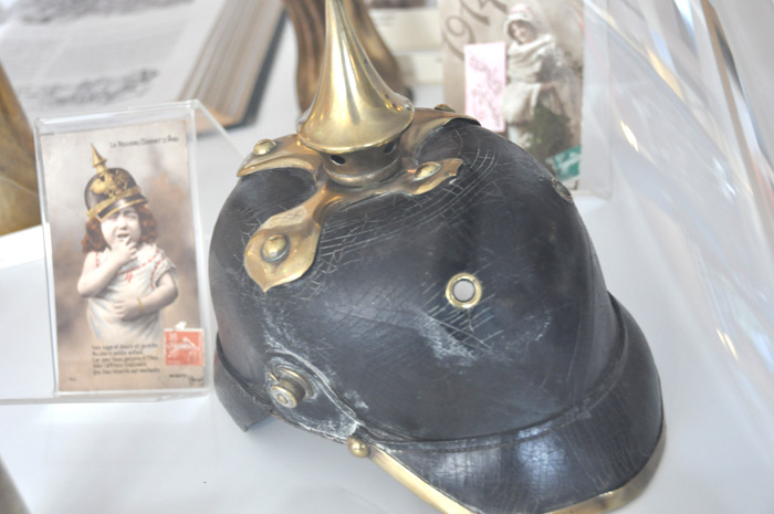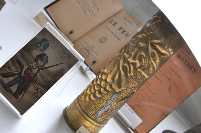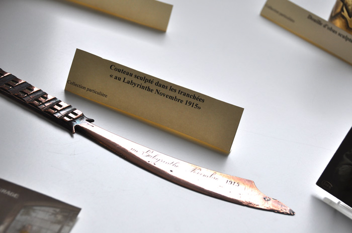 Ces documents papiers sont accompagnés de petits objets (obus, couteau…) fruit du travail des poilus dans les tranchées et de casques issus de collections particulières, prêtés à cette occasion.
