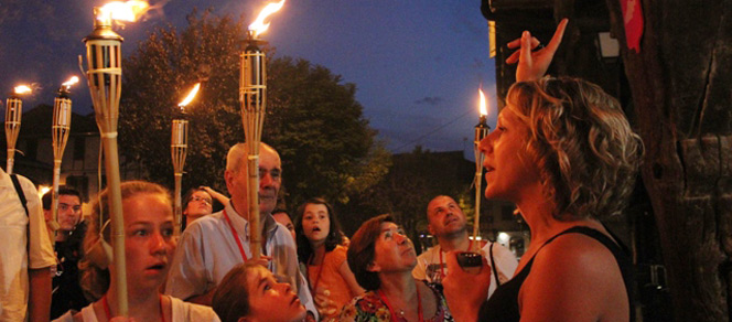 À la tombée de la nuit (vers 21h30), et à la lueur des flambeaux, Marina Salby, guide conférencière, dévoile à son public des pans d'histoire locale.