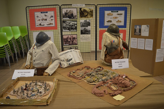 Le Dr Claude Monastié a prêté ses maquettes pour l'occasion, les anciens combattants leur drap mortuaire et leurs drapeaux. Dans un coin de la salle Mermoz, zoom sur le travail documentaire, les maquettes ou les fables des CM1 et CM2. Monsieur Doumerc, commissaire départemental à la commémoration s'est lui aussi investit pour cette célébration et a fourni photos, vêtements, ou objets.