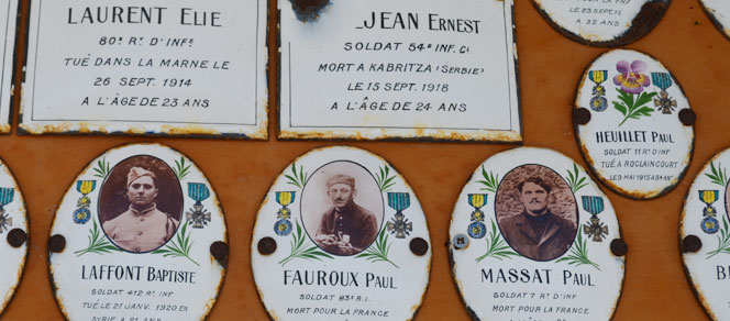 En effet, deux noms manquent à la liste des soldats morts au combat durant le conflit : ceux d’Armand Freyche et de Paul Fauroux. Pour chacun de ces soldats cependant, une photographie sur plaque émaillée est bien présente sur le monument, indiquant leurs nom, prénom, régiment et date du décès. Alors, comment expliquer que leur nom n’ait pas été gravé aux côtés des autres?