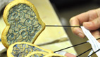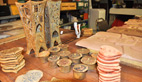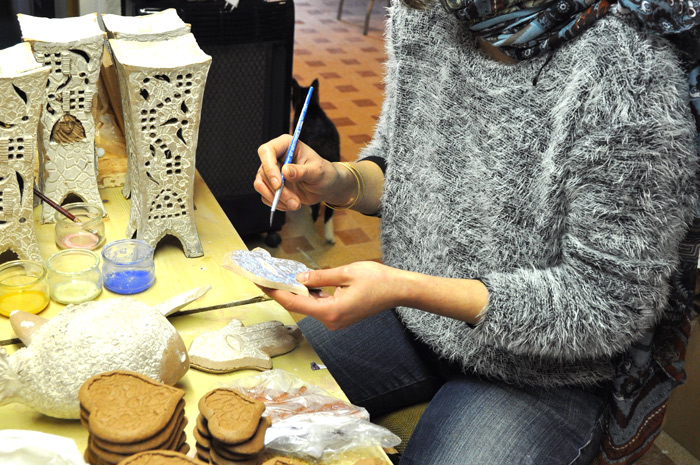 La pièce en terre cuite réagit en fonction de la cuisson, elle change de couleur et rétrécit, aussi c’est toujours un peu une surprise quand elle ouvre son four «la basse cuisson est utilisée pour la faïence, la haute cuisson pour le grès et la porcelaine» Après le travail de la terre, notre céramiste passe des heures à chercher des couleurs pour ses émaux.Une passion qui se décline auprès des enfants en milieu scolairePerrine travaille essentiellement sur des commandes précises comme ce bas-relief égyptien qui viendra à l’intérieur d’un restaurant mais elle intervient aussi en milieu scolaire, à l’école de son village où grâce à la réforme des rythmes scolaires on a fait appel à elle pour intervenir sur le temps périscolaire: