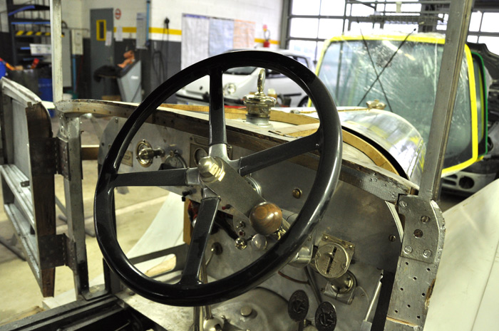 «Tout est monté à petit clou, à la main, et pas forcement des panneaux entiers, ce sont des morceaux soudés bord à bord, une technique de chaudronnerie qui existait depuis la fin du XIXème siècle et qui a perduré jusque dans les années 30. Voisin faisait beaucoup de carrosseries à partir de 1925 en aluminium. Mais sur ce modèle nous sommes sur du fer car elle a été carrossée par la maison Besset, un carrossier ardéchois dont la spécialité était de fabriquer des voitures en fer sur âme de bois.