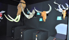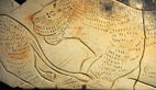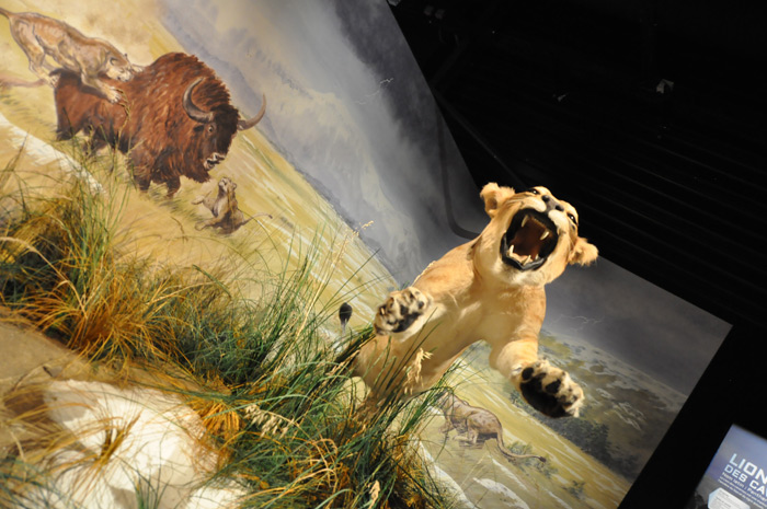 «Au-delà du visuel de l’animal, une fiche d’identité indique les interactions qu’il peut y avoir avec l’homme: il le chasse, utilise ses bois, ses os… et comment il le représente. Ici une représentation de mégacéros de la grotte de Cougnac dans le Lot, pour le lion des cavernes le lissoir de la grotte de la Vache (une grotte ariégeoise située en face celle de Niaux). Et pour comprendre l’animal dans sa globalité, il est représenté ici en position d’attaque dans son paysage de steppe.