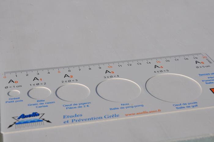 «Le grêlimètre est une plaque de polystyrène que l’on place à côté du générateur afin de calculer l’intensité des grêlons dont nous mesurons ensuite le calibre avec une réglette: cela va du plus petit (taille d’un petit pois ou A0) à la taille d’une balle de golf (A4) voire à celle d’une pomme (A5). Je vous laisse imaginer les dégâts sur les baies vitrées d’une maison ou sur la tôle d’une voiture!»
