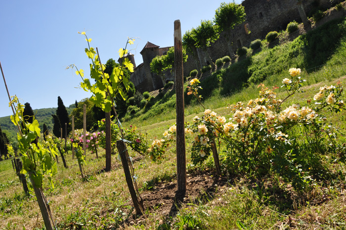 Autrefois les moines, propriétaires de nombreuses terres, obligeaient les villageois installés sous leur protection, à cultiver vignes et céréales afin d’assurer les redevances dues à l’abbaye. Ces paysans-vignerons vont défricher, construire terrasses et systèmes hydrauliques qui faciliteront les cultures du raisin. Cette culture traditionnelle s’est arrêtée avec l’épidémie du phylloxéra au début du XXème siècle mais depuis deux ans, Hélène et René Laffargue anciens viticulteurs du bordelais tombés sous le charme de ce village médiéval renouent avec cette tradition.
