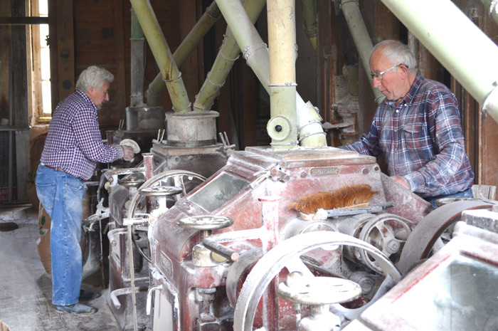 «Nous on est ici depuis1957 et mon père a acheté en 1961, poursuit Jean-Claude. C’est dans la région le plus ancien moulin qui soit encore en activité. Et c’est le plus vieux moulin» Plus de 150 ans à eux deux et meuniers, minotiers plus précisément, depuis la fin de leur service militaire, comme déjà le furent leur père et leur grand-père. Ici, ils donnent naissance à leur mouture, comme on le faisait autrefois, à l’ancienne pour une production de farines variées bio pour l’essentiel.