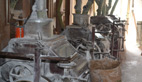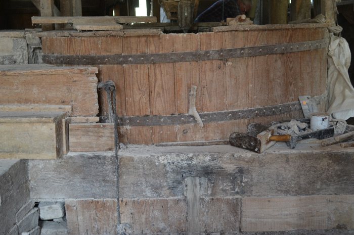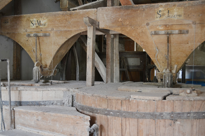 De courroies, en arbre de transmission et autres engrenages, chaque pièce joue son rôle, depuis ce simple axe central actionné par la chute de l’eau sur le rouet. Le Moulin travaille, sur trois étages. Deux meules en pierre, en silex plus exactement, (elles étaient quatre à l’origine) prénommées Sainte-Marie et Saint-Joseph, broient le grain de blé ou de maïs et donne naissance à la mouture.
