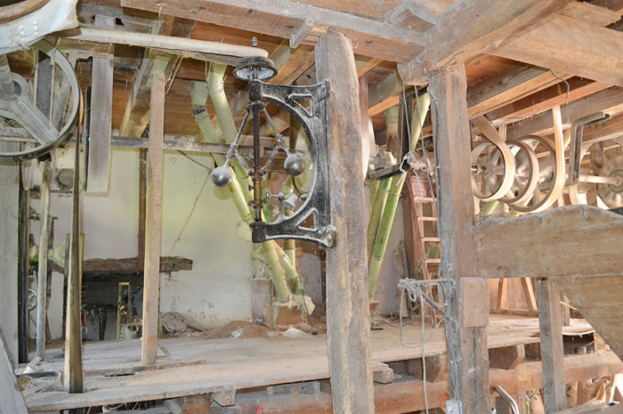 Le tout rythmé par un ingénieux régulateur, datant de Watts et l’invention des machines à vapeur dont le carillon indique que l’ensemble tourne à la bonne allure (environ 150 tour/min) et sert aussi d’avertisseur au meunier comme dans la comptine. «Chaque machine a sa vitesse propre donc il faut adapter la vitesse du moulin à l’ensemble des machines. Ce régulateur nous aide à être plus précis»